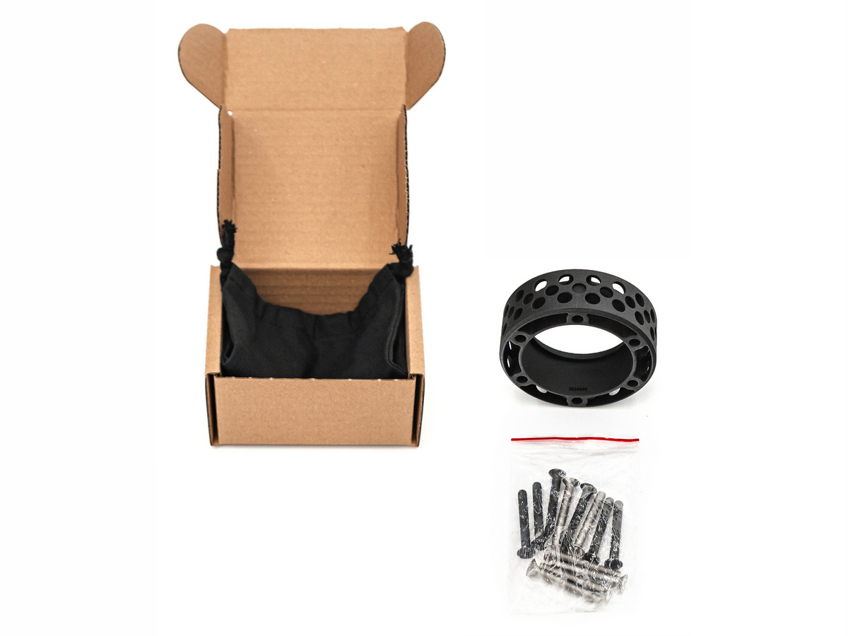 Das Set beinhaltet: Ultra-Spacer, 6 schwarze Schrauben, 6 silberne Schrauben. Verpackt in einem Stoffbeutel und einem Karton.