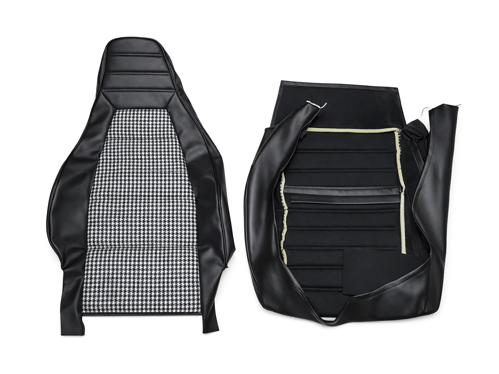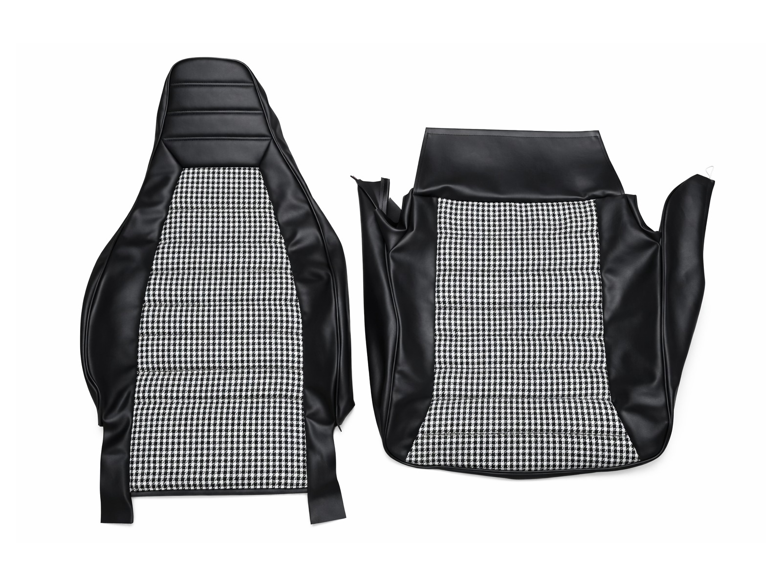 Dieser Sitzbezug besteht aus strapazierfähigen, schwarzen Vinyl-Seitenwangen in Automobilqualität und einem klassischen schwarz-weißen Pepita-Stoffbezug (Hahnentrittmuster). Die horizontalen Ziernähte und das Musterdesign sind dem originalen Porsche-Interieurdesign der 1970er- bis frühen 1980er-Jahre detailgetreu nachempfunden.