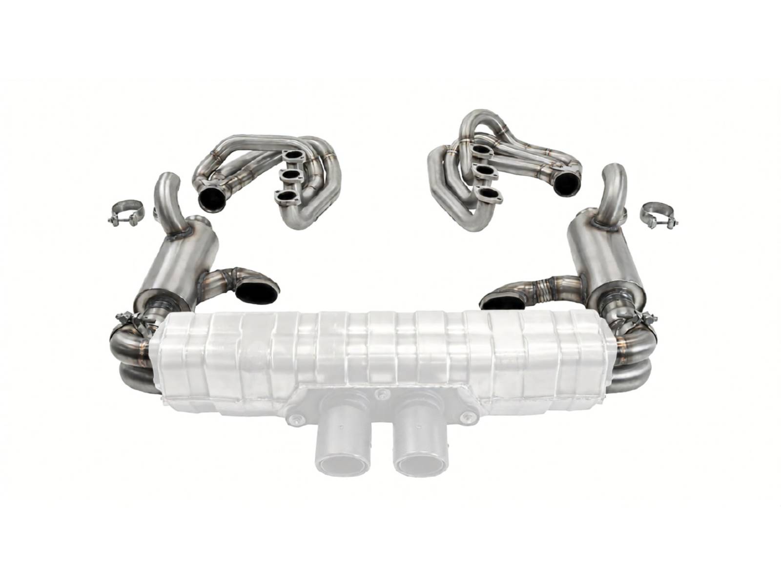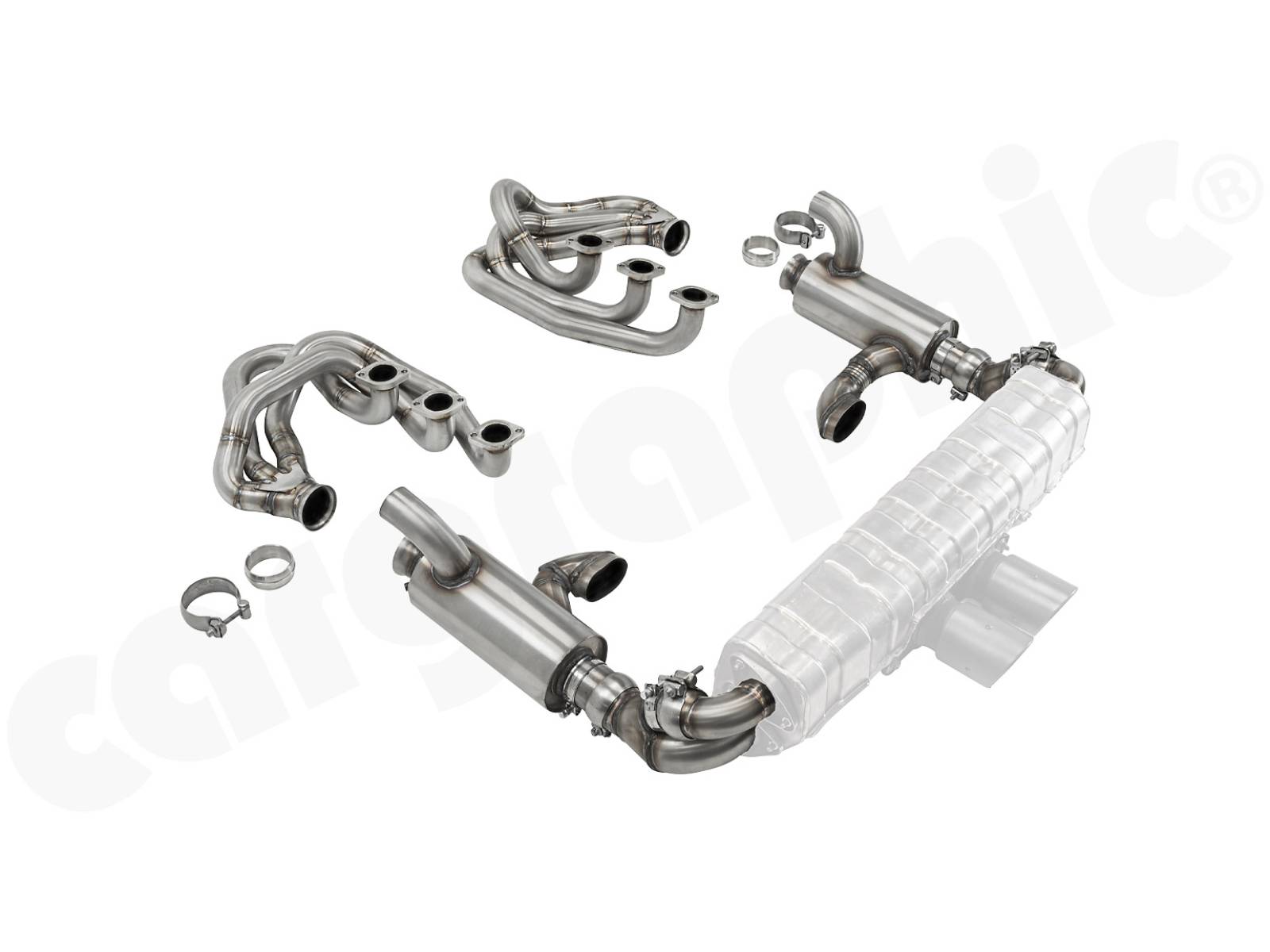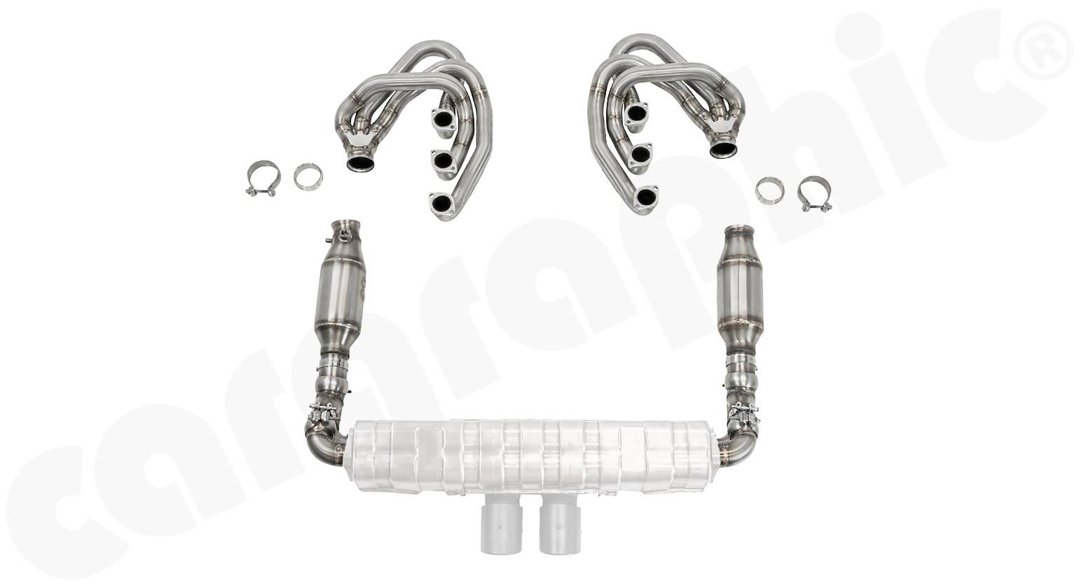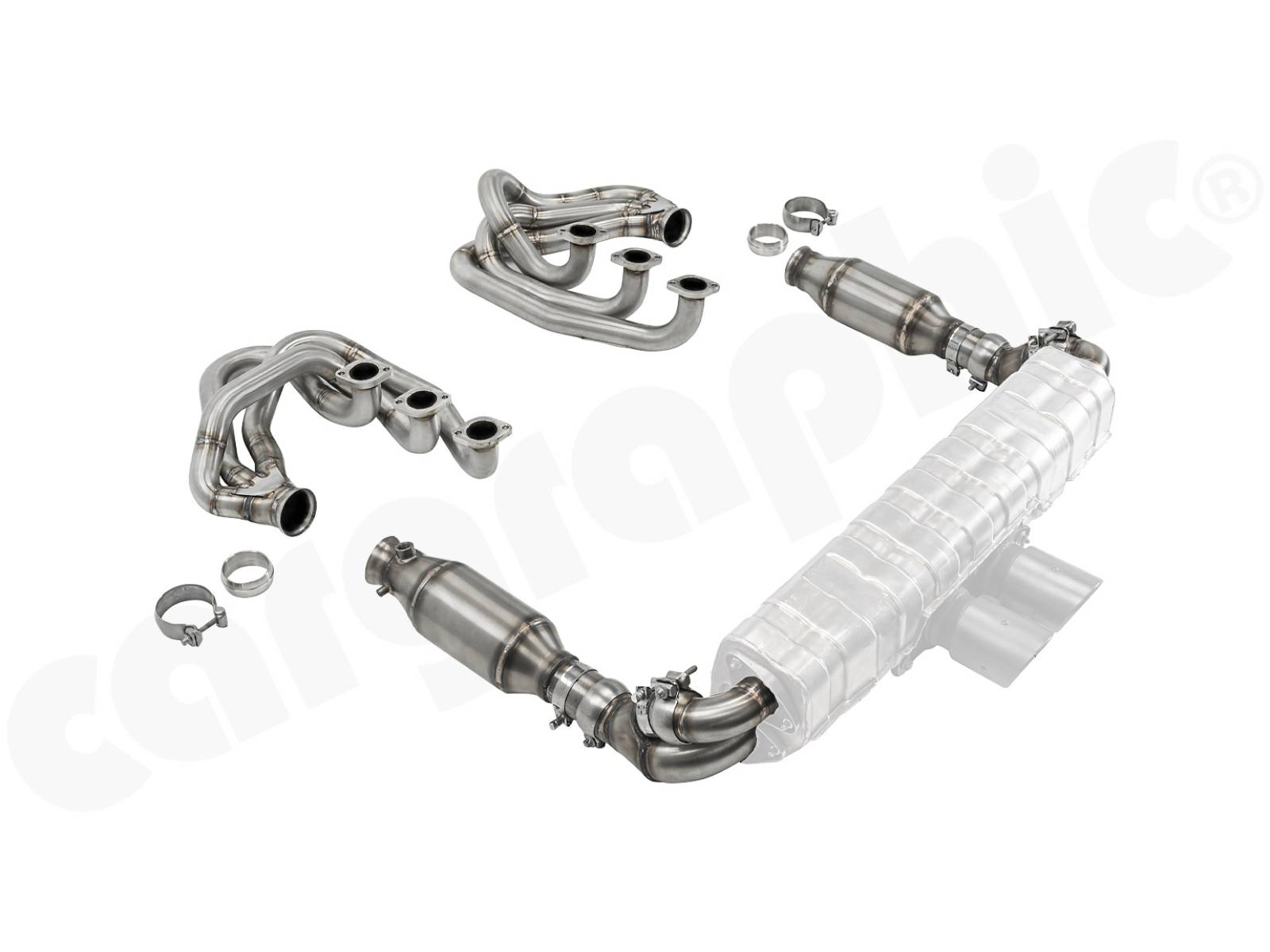 CARGRAPHIC GT Sportauspuffanlage Rückbau mit ID42 GT Krümmersatz, mit / ohne 2x200cpsi Katalysatoren, ohne Heizung zur Verwendung mit OEM GT3 Endschalldämpfer.