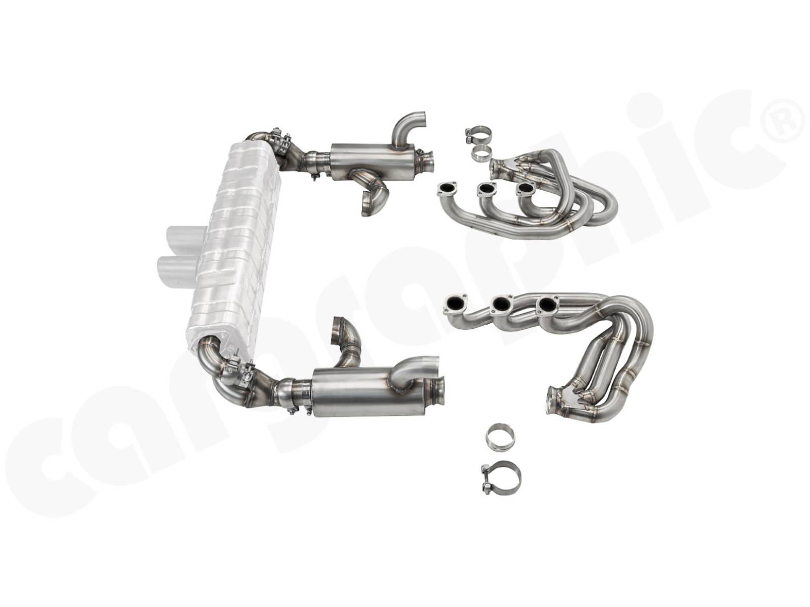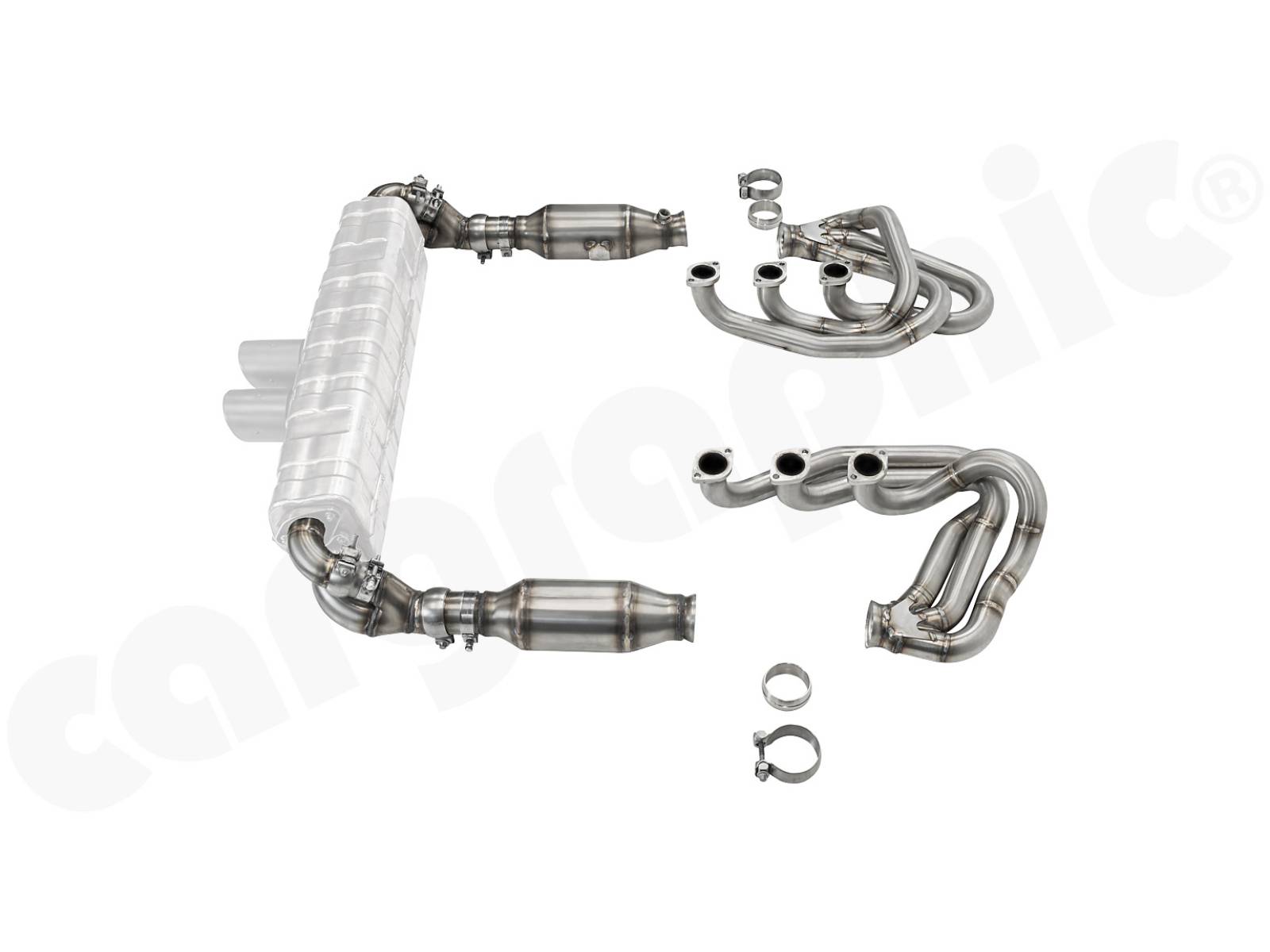 CARGRAPHIC GT Sportauspuffanlage (Backdate) mit ID42 GT Krümmer, mit/ohne 2x100cpsi MS Katalysatoren und 4>2 Flow Endschalldämpfer mit mittigem Auslass (2x70mm GT3-Optik). System ohne Heizung.