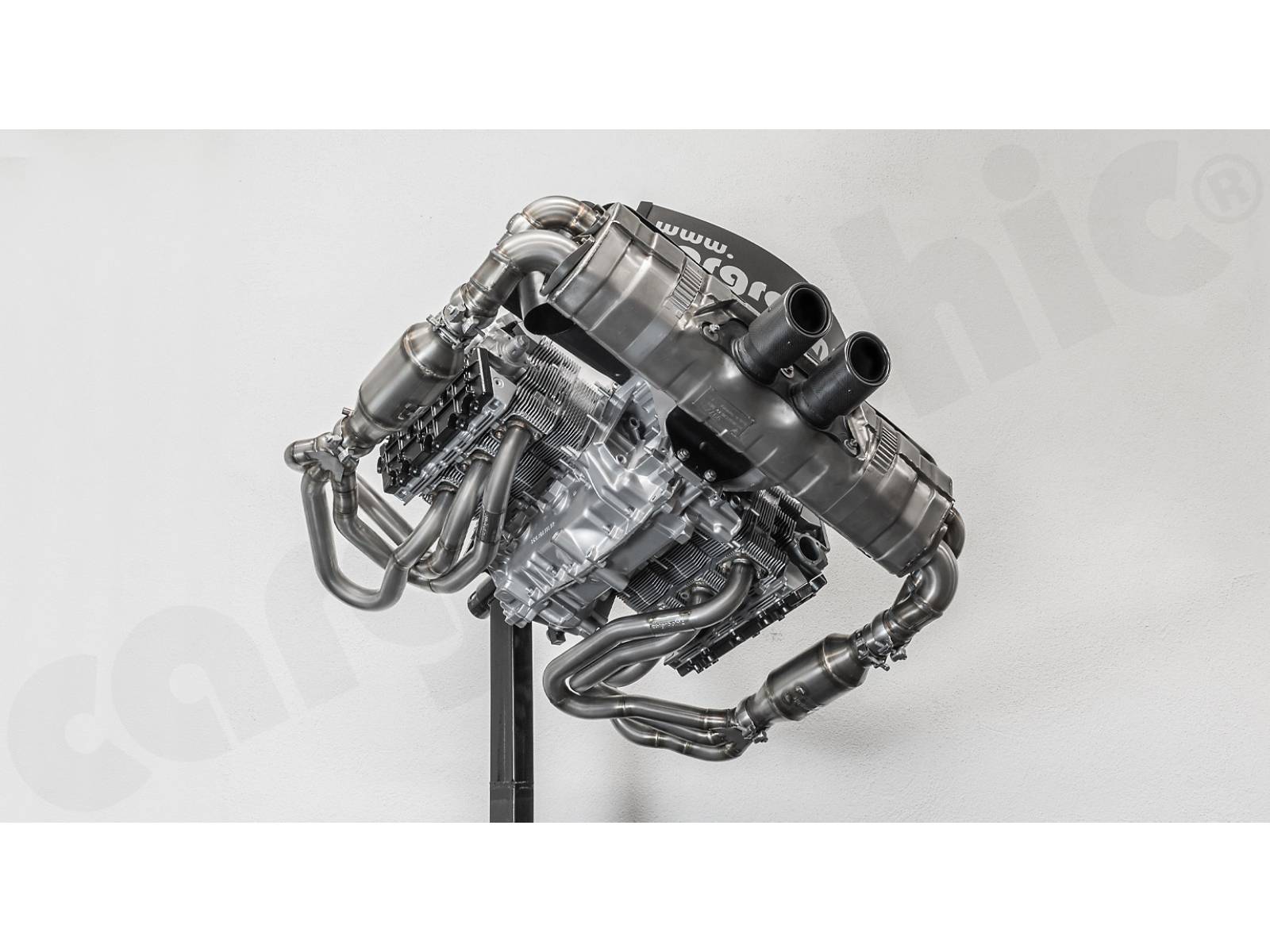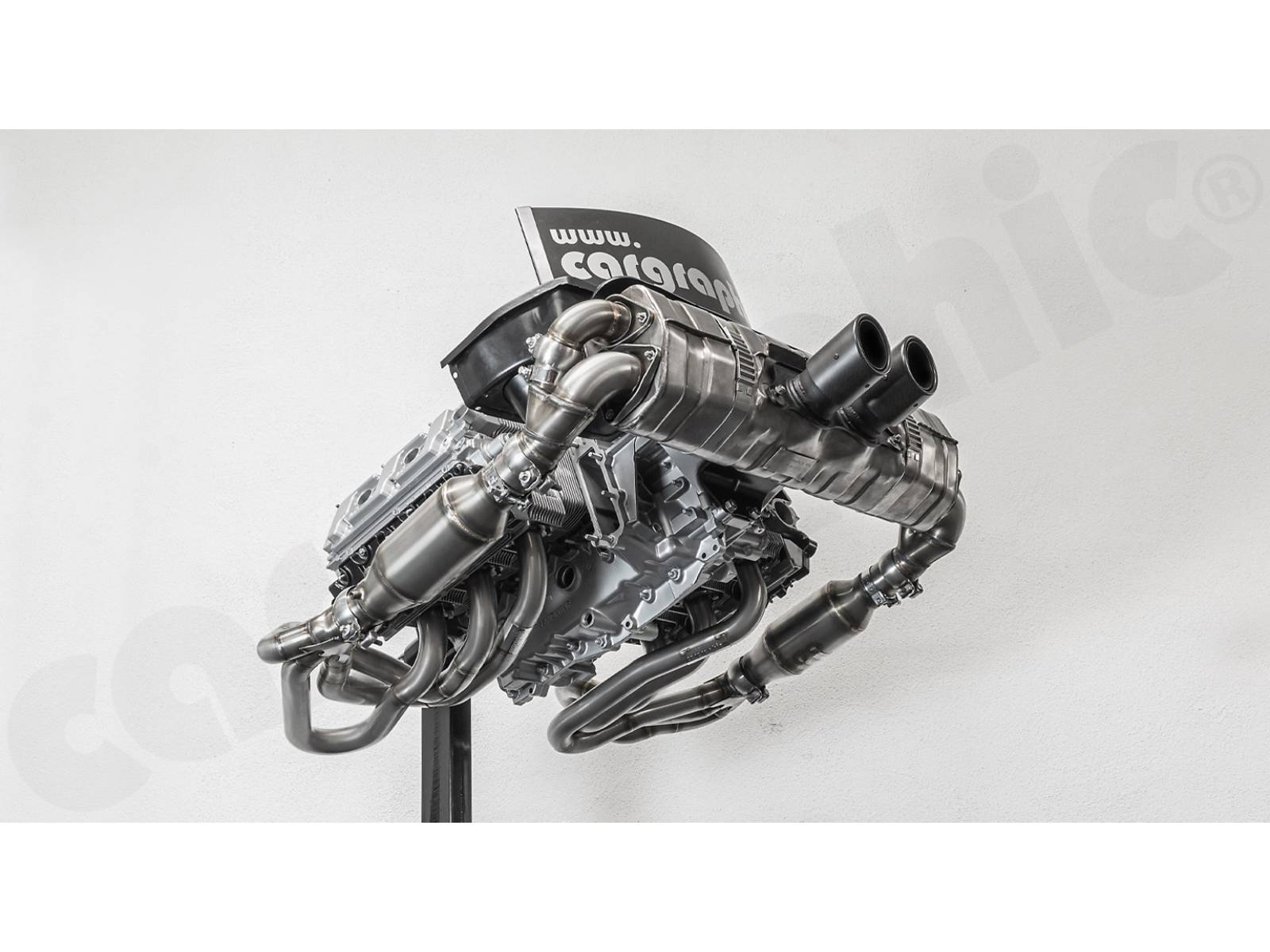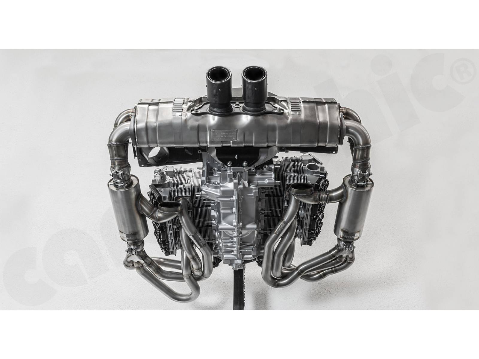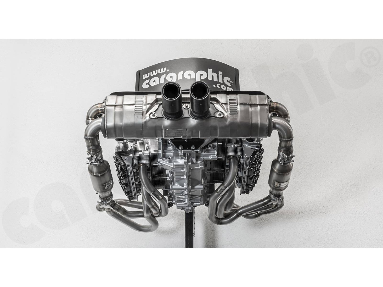 CARGRAPHIC GT Sportauspuffanlage (Rückversion) mit ID45 GT Krümmer, mit/ohne 2x200cpsi Katalysatoren, mit Heizung , Auslassklappen und 4-2-Endschalldämpfer mit mittigem Auslass (2x70 mm GT3-Optik).