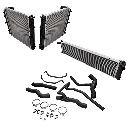 Die Kits enthalten beide Kühler, Zu- und Rücklaufschläuche, Entlüftungsrohre sowie alle benötigten Klemmen und Schellen.