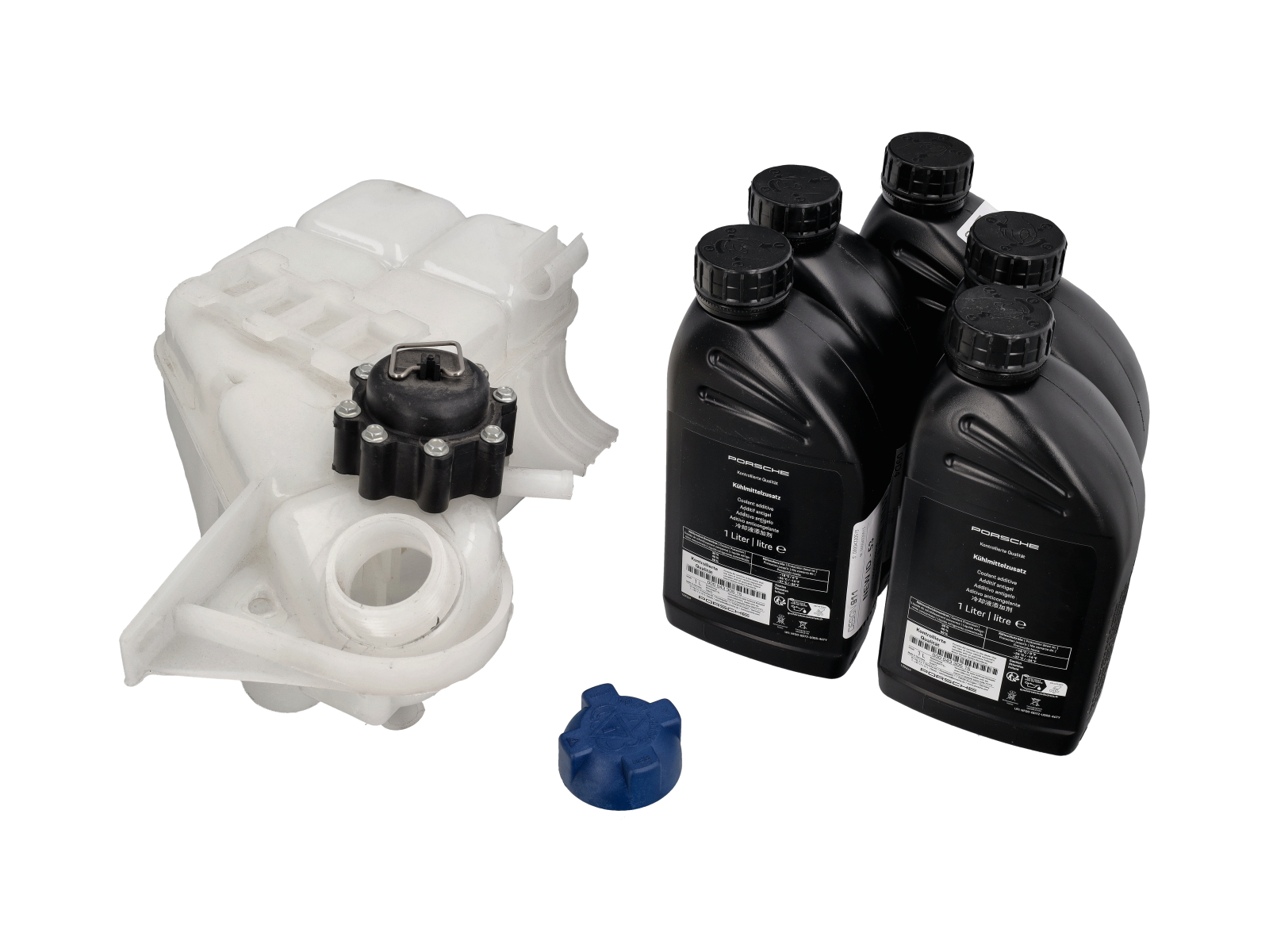 Dieses Set enthält den Ausgleichsbehälter, den Druckverschluss und mehrere Flaschen Original-Porsche-Kühlmittel/Frostschutzmittel – alles, was für eine vollständige Erneuerung des Kühlsystems benötigt wird.