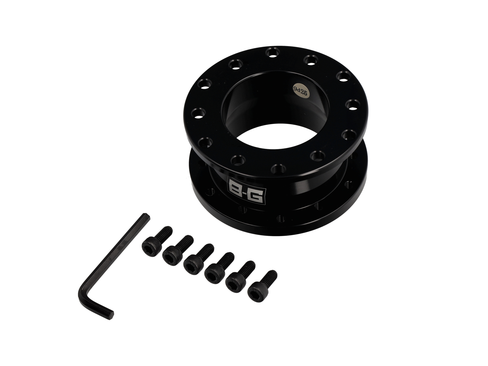 Der schwarz eloxierte 80- mm-Lenkradabstandshalter von BG Racing ist aus hochwertigem Aluminium gefertigt und wird komplett mit Befestigungsschrauben geliefert.