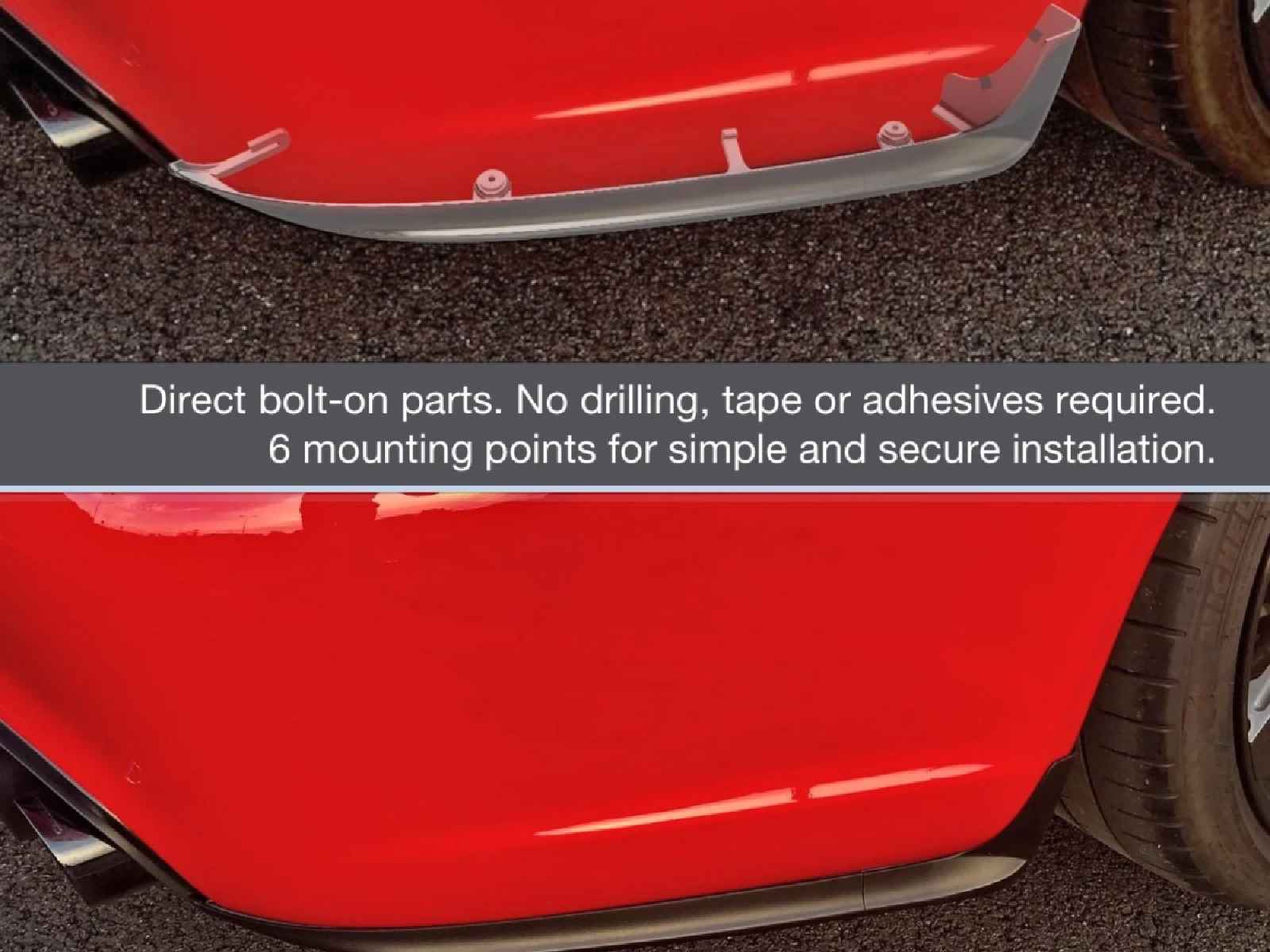 Diese Splitter sind so gefertigt, dass sie sich nahtlos in die Linienführung der werkseitigen Heckstoßstange einfügen. Sie lassen sich schnell und ohne Bohren oder sonstige Modifikationen anschrauben und sind daher ein beliebtes Zubehörteil für Enthusiasten, die eine dezente, aber dennoch wirkungsvolle Aufwertung anstreben.
