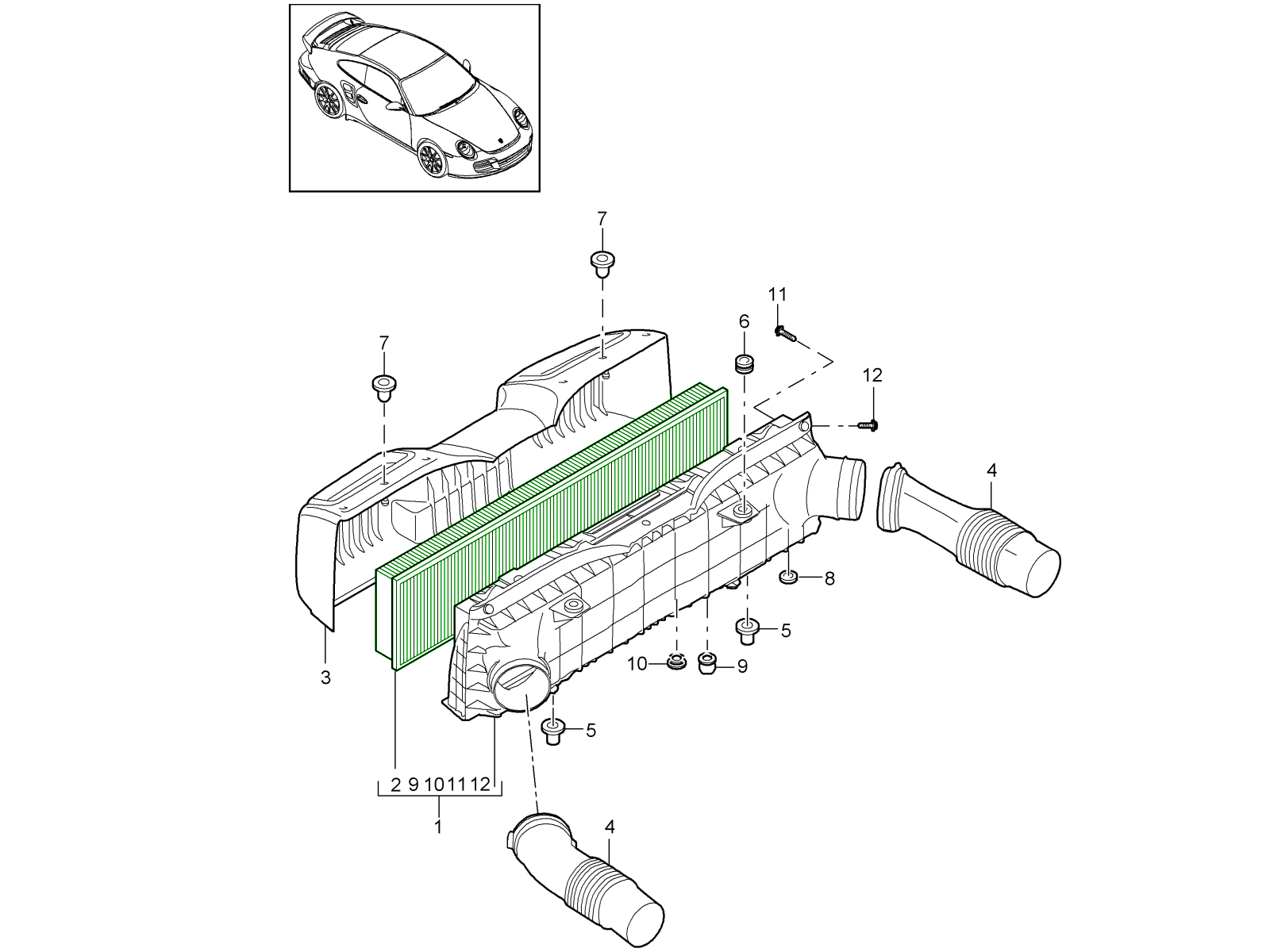 Original Porsche Original Equipment (OE) Motorluftfilterelement – der werkseitig spezifizierte Luftfilter für die Porsche 911 (997.2) Turbo und Turbo S (3,8 l) Modelle. Er ist im Luftfilterkasten des Fahrzeugs verbaut und verhindert, dass Staub, Schmutz, Pollen und andere Luftschadstoffe in das Ansaugsystem des Motors gelangen, während er gleichzeitig einen ungehinderten Luftstrom ermöglicht.