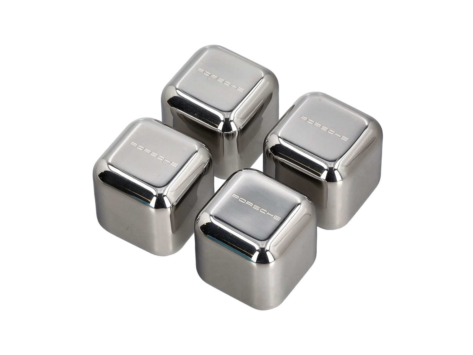 Vier Porsche-Eiswürfel aus Edelstahl mit lasergraviertem Porsche-Schriftzug – geschmacksneutral, langanhaltend kühlend, wiederverwendbar.