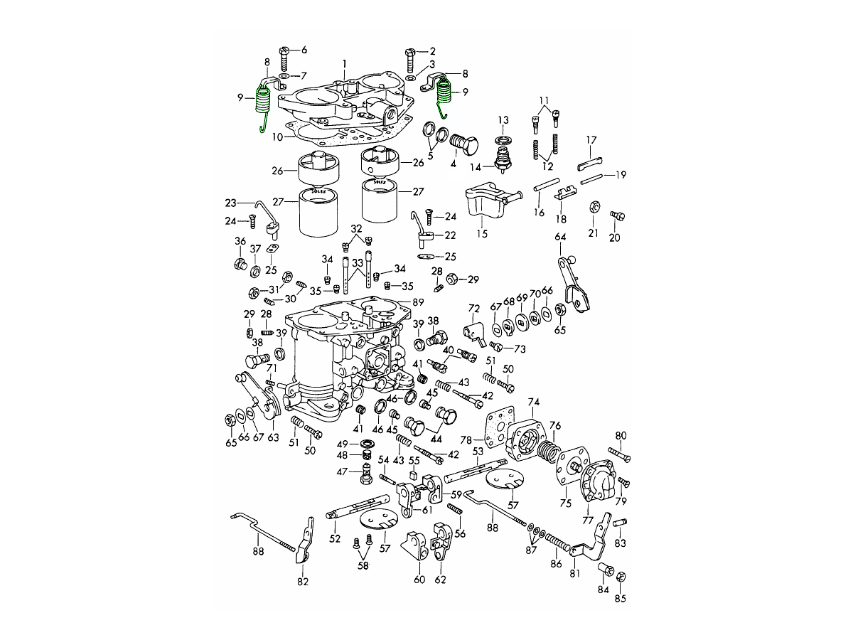 Este resorte se utiliza en los carburadores Solex 40 PII-4 instalados en los modelos Porsche 356 y 912. Se monta en el varillaje del acelerador / palanca de mariposa en el carburador, enganchado entre el brazo del eje del acelerador y un punto fijo en el cuerpo o soporte del carburador.