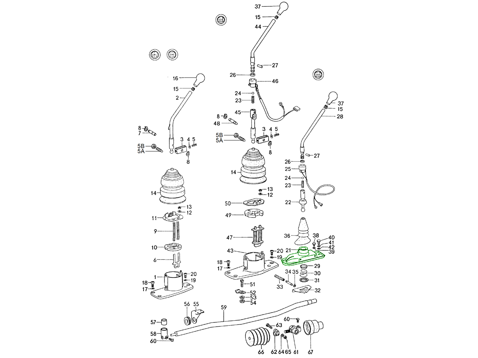 La carcasa de la palanca de cambios actúa como estructura de montaje y soporte para la palanca selectora de marchas. Fija el conjunto de la palanca en su posición y lo conecta al varillaje interno de cambios que acciona la transmisión Sportomatic.