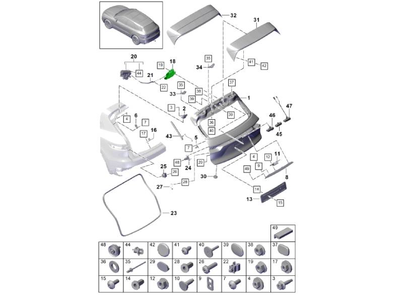 El cierre de la tapa trasera es un componente esencial del sistema de cierre del portón trasero del vehículo, diseñado para asegurar la tapa del maletero cuando está cerrada. Este mecanismo de cierre se acopla con el pestillo del portón trasero y el sistema de cierre centralizado para mantener el compartimento de equipaje cerrado de forma segura tanto en marcha como estacionado.