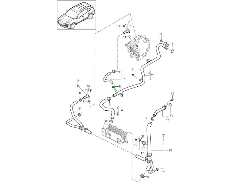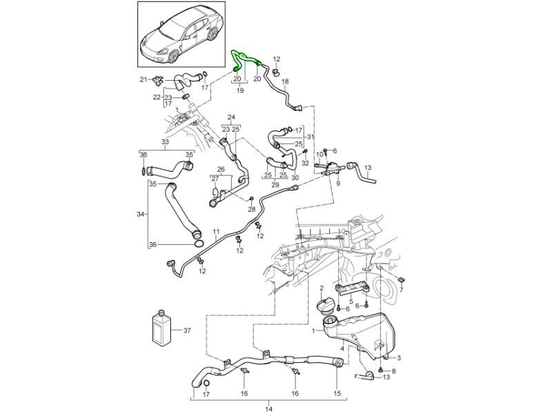 La durite de liquide de refroidissement est une durite d'origine Porsche (OEM) conçue pour transporter le liquide de refroidissement dans le système de refroidissement de certains modèles Porsche Panamera (970). Cette durite flexible assure une circulation fiable du liquide de refroidissement entre les composants du système, contribuant ainsi au maintien d'une température de fonctionnement moteur stable et à un chauffage performant. Fabriquée selon les spécifications Porsche, elle offre un ajustement précis, une haute résistance à la chaleur et à la pression, ainsi qu'une grande durabilité.