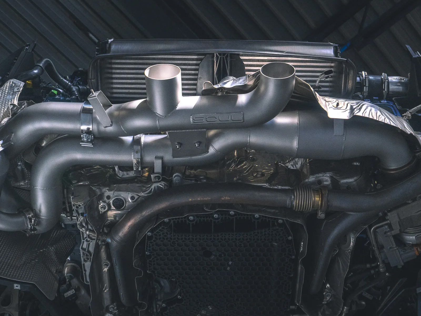 Le système d'échappement haute performance SOUL 992.2 GTS est conçu avec précision pour une intégration parfaite avec le système de surveillance des particules d'origine Porsche. Ainsi, ce système offre une sonorité et des performances exceptionnelles sans allumage du voyant moteur ni nécessité de dispositif de blocage OBD.