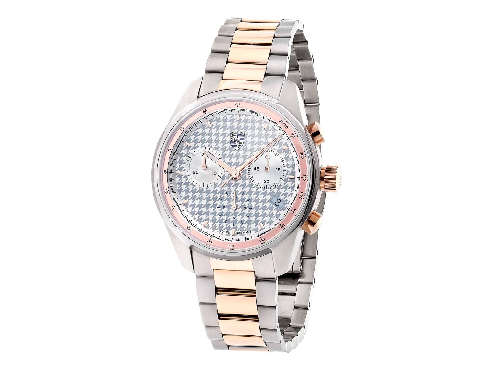 Il cronografo dell'esclusiva collezione Pepita è stato progettato dallo Studio FA Porsche. Le caratteristiche contemporanee vincono la gara: dotato di un movimento al quarzo analogico RONDA e di una cassa in acciaio inossidabile finemente spazzolato, il cronografo affascina con la corona lucida e i pulsanti con rivestimento in oro rosa, nonché con lo stemma Porsche inciso sul quadrante. Il vetro minerale con trattamento zaffiro e antiriflesso protegge il quadrante, che presenta una stampa 3D monocromatica del motivo Pepita e dello stemma Porsche. Le lancette delle ore e dei minuti rivestite in Super-LumiNova garantiscono una leggibilità ottimale. Oltre alla finestrella della data a ore 4, il cronografo vanta tre totalizzatori per una misurazione completa del tempo: contatore dei secondi (ore 3), contatore cronografico dei 30 minuti (ore 9), contatore cronografico delle ore (ore 6). La chiusura a farfalla, impreziosita dalla scritta Porsche incisa, e la scritta "Made in Germany" a ore 6 completano l'aspetto esclusivo. In breve: i dettagli raffinati e la perfetta combinazione di forma e funzione rendono il cronografo Pepita un vero must-have per tutti gli appassionati di corse.