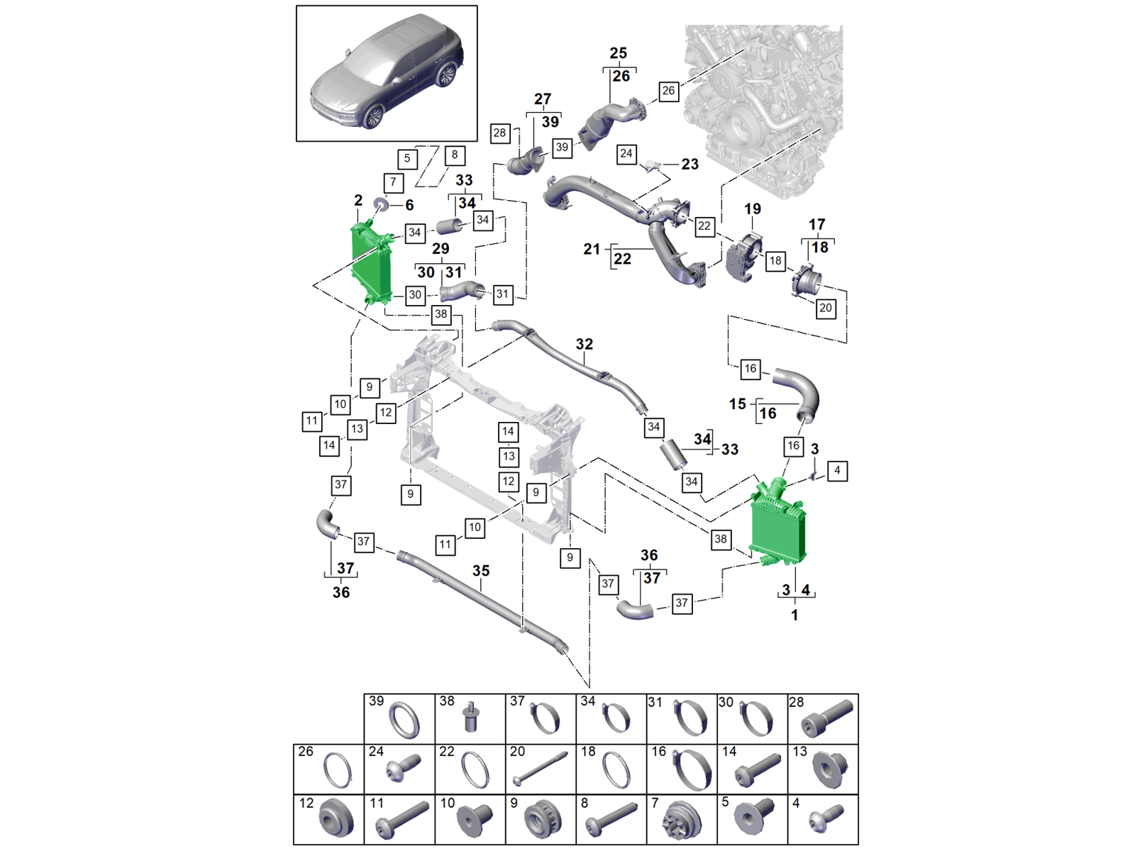 Questi radiatori sono specifici per i modelli Porsche Cayenne (9YA) dotati di motore turbocompresso da 3,0 litri prodotti a partire dal 2019 circa. Sono posizionati a sinistra e a destra del circuito di sovralimentazione e sono venduti singolarmente.