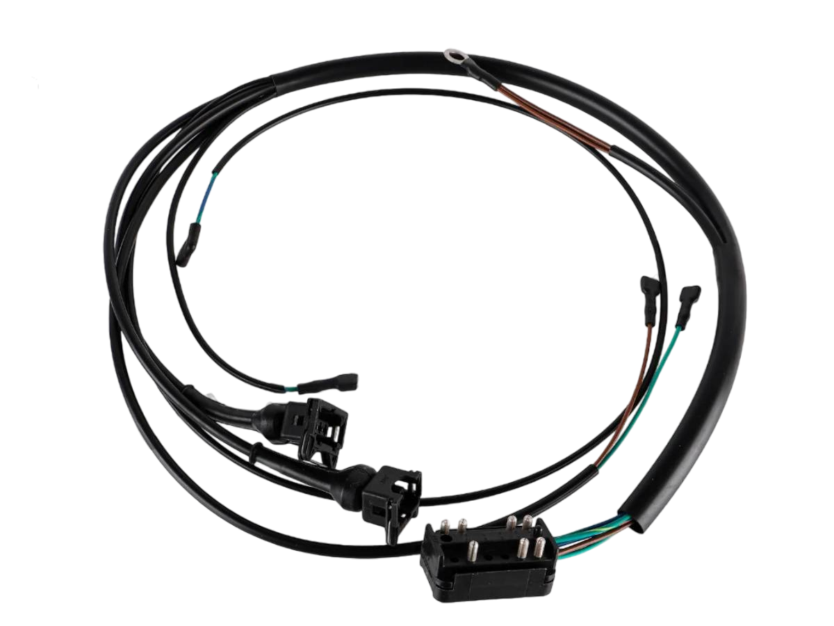 Cablaggio anteriore completo dalla scatola dei fusibili alla parte anteriore, fari, clacson, indicatori di direzione, pompa lavavetri, fendinebbia. Ogni filo alla giusta lunghezza con cablaggio originale codificato a colori. Connettori H4 inclusi.
