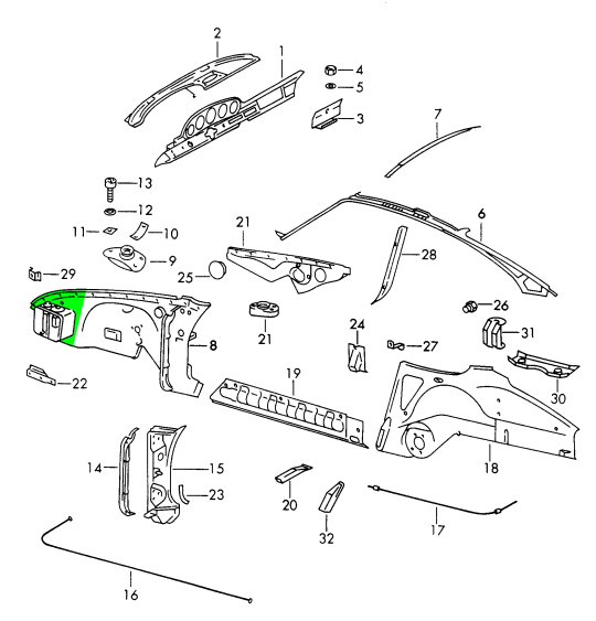 Sezione anteriore e pannelli del telaio fedeli all'epoca per modelli Porsche d'epoca come la 356, la 911 Classic e la 912, realizzati per garantire autenticità e un restauro di precisione.