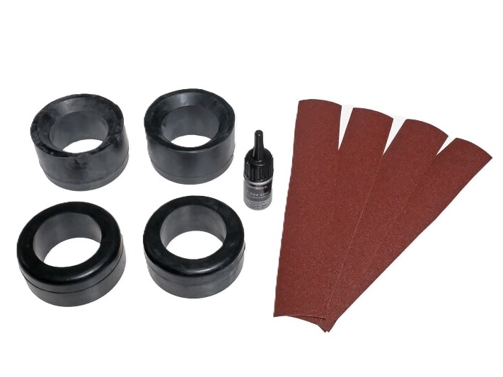 Più che semplici boccole, questo è un kit completo che include boccole interne ed esterne (4 pezzi), adesivo, istruzioni e panno abrasivo per preparare la superficie.