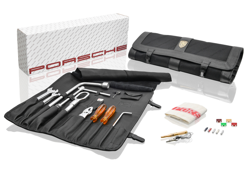 La borsa degli attrezzi è realizzata in tessuto rapport, tipico di tutti i modelli Porsche dell'era transaxle. Il centro della borsa è decorato con la nuova edizione del caratteristico stemma Porsche dalla chiusura del vano portaoggetti dei primi modelli 924 e 944.
