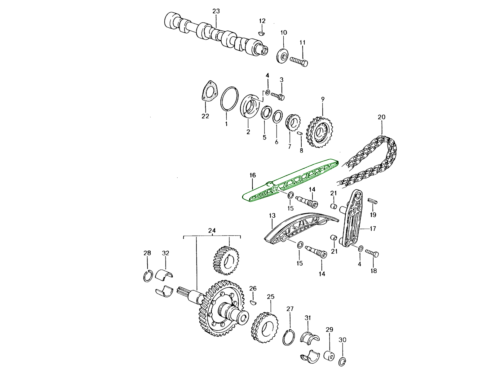 • Positie: Gemonteerd langs de distributieketting in het carter, naast de kettingspanner en tandwielen.