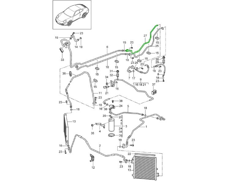 The Air Conditioning Suction Line, Evaporator to Compressor is a genuine OEM Porsche component designed to carry low-pressure refrigerant from the evaporator back to the A/C compressor. This suction line plays a critical role in completing the refrigeration cycle, ensuring efficient cooling and consistent climate control performance.
