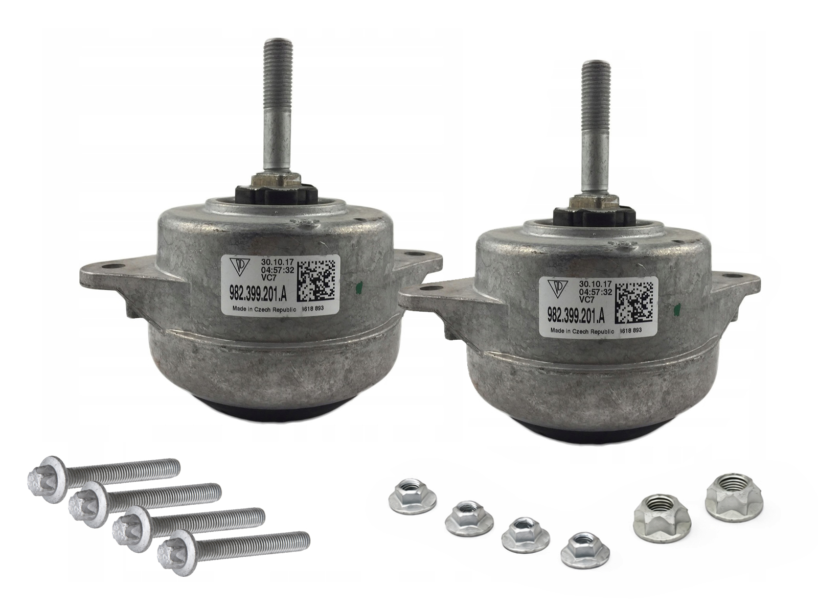 Gearbox mount set. This complete Genuine Porsche Gearbox Mount Kit includes two hydraulic gearbox mounts (982399201A) together with all required original mounting hardware for installation. The kit is designed to support the engine and transmission assembly on Porsche 718 Boxster and 718 Cayman (982) models without Dynamic Engine Mount