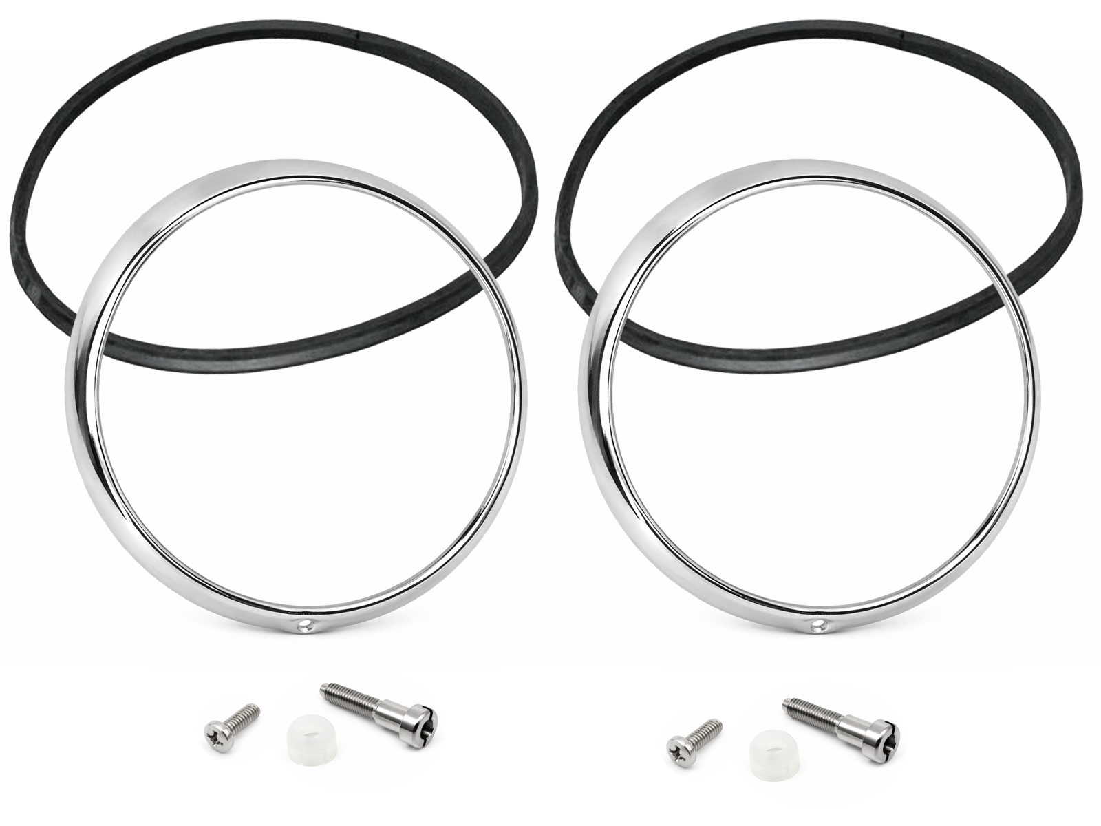 The bezel covers hold the headlamp assembly firmly in place and provide a decorative trim ring that blends the headlamp into the vehicle’s bodywork. The included rubber seals prevent water and dirt from entering the gap between the headlamp and the wing, while the screws and washers allow proper and secure installation.