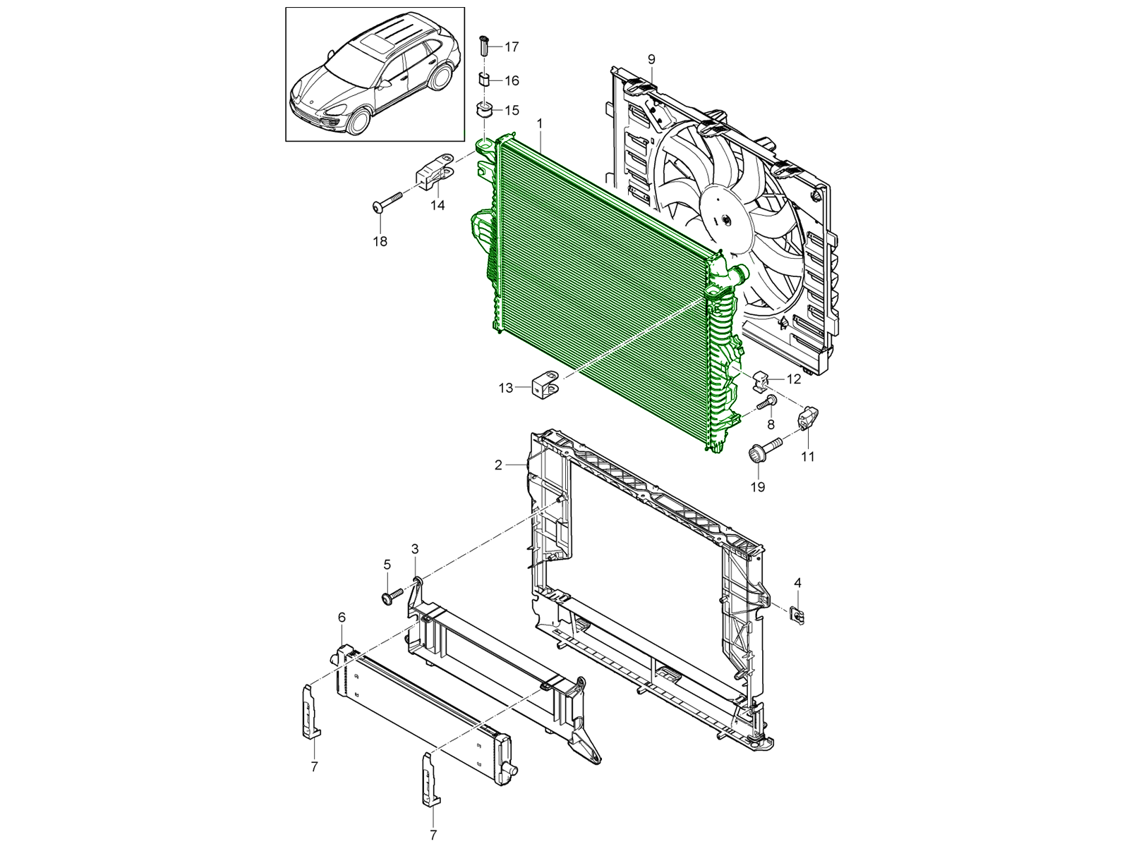 The radiator is the primary heat exchanger in the cooling system. Coolant heated by the engine flows through the radiator’s core, where airflow draws heat away before the coolant returns to the engine. This circulation: