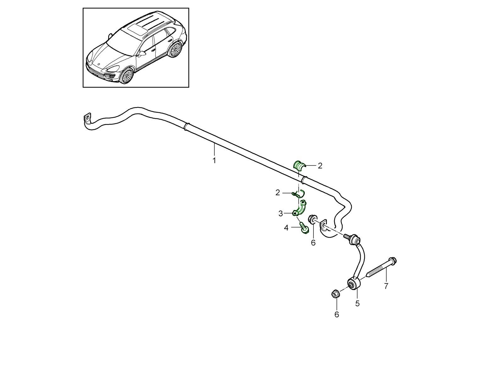 Rear stabilizer bar bush set with bolts and clamps, Size: 24.10mmThe OE Match Rear Stabilizer Bar Bush Kit with bolts and clamps is a complete rear anti-roll bar mounting solution for Porsche Cayenne models. It includes four OE Match bush halves, along with genuine Porsche bolts and mounting clamps for a full and secure installation.