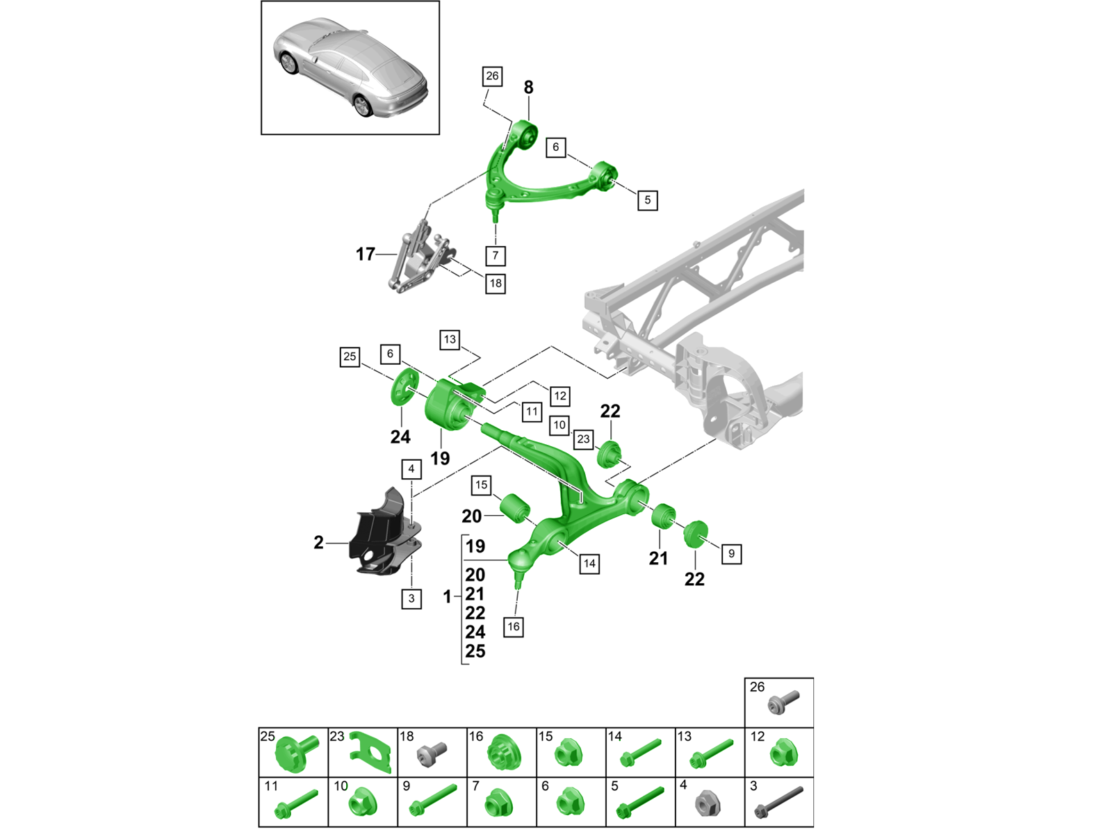 1 x Lower wishbone complete. Porsche 971 Panamera (Basic Load Group 1) (971407152T/1)