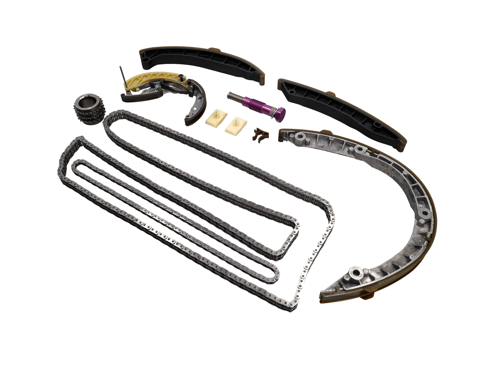 Complete replacement timing chain set. It includes the main drive chain, oil-pump drive chain, sprockets/gears, chain guides, and tensioner components needed to synchronise the crankshaft and camshafts - ensuring precise valve timing and pump operations.