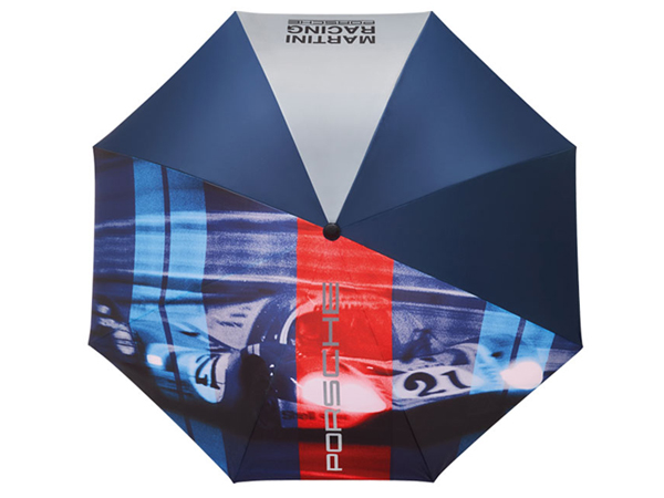 Porsche Umbrella – MARTINI RACING CollectionLarge umbrella, able to fit 2 people underneath, with MARTINI RACING design. Sporty, ergonomically shaped handle with 'PORSCHE' logo. With MARTINI RACING inlay at the end of the handle and integrated automatic opening mechanism. Teflon-coated cover made of 100 % polyester. Red anodised aluminium shaft.
