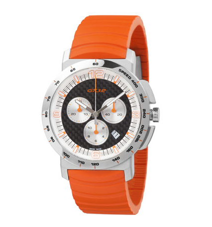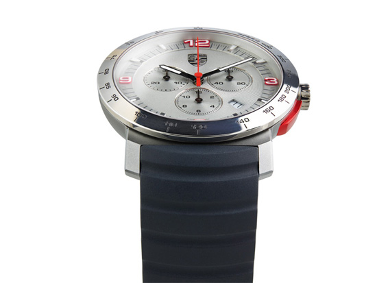 Silver dial. Base colour: Silver. Rubber strap in Silver Grey. Luminescent hands, stopwatch function with split-time measurement and tachometer. Extra-hard sapphire glass with anti-reflection treatment to ensure clear visibility. Integrated rubber watchstrap with stainless steel fastener.
