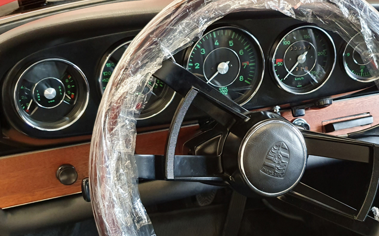 This early "Wood Dash" 911 SWB has been off of the road for the several years, but remains very original overall including much of the upholstery, factory etched glass, horn grills, bumperettes, body stampings, trim and older paintwork. The car is fitted with steel wheels.