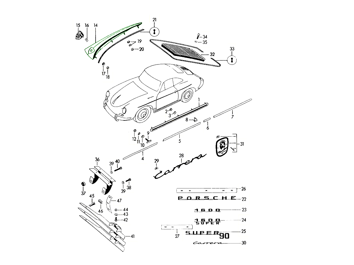 • Mounted across the front bonnet of Porsche 356, 356A, 356B, 356C models (approx. 1950s–1960s)