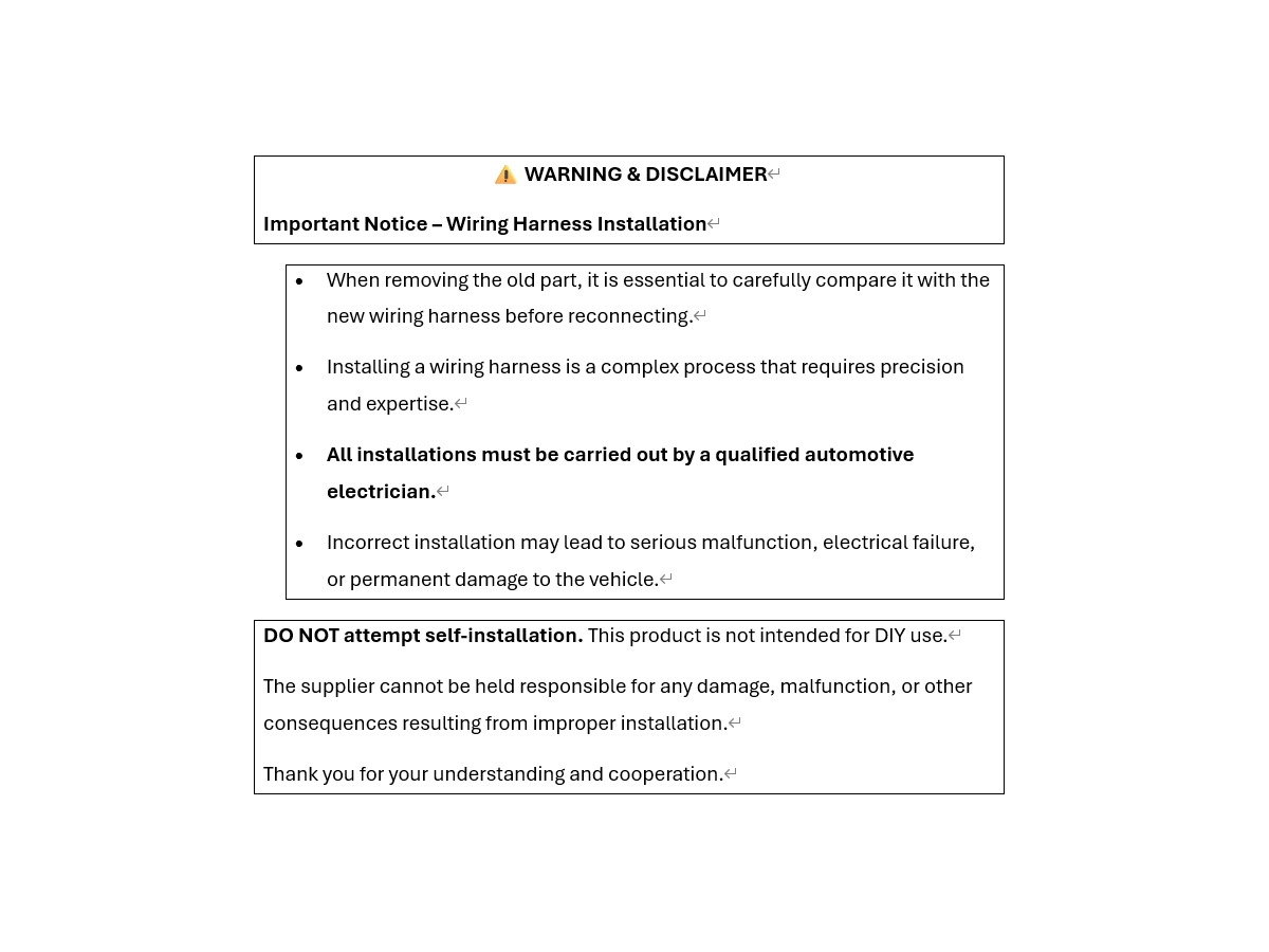DO NOT attempt self-installation. This product is not intended for DIY use. All installation must be carried out by a qualified automotive electrician.