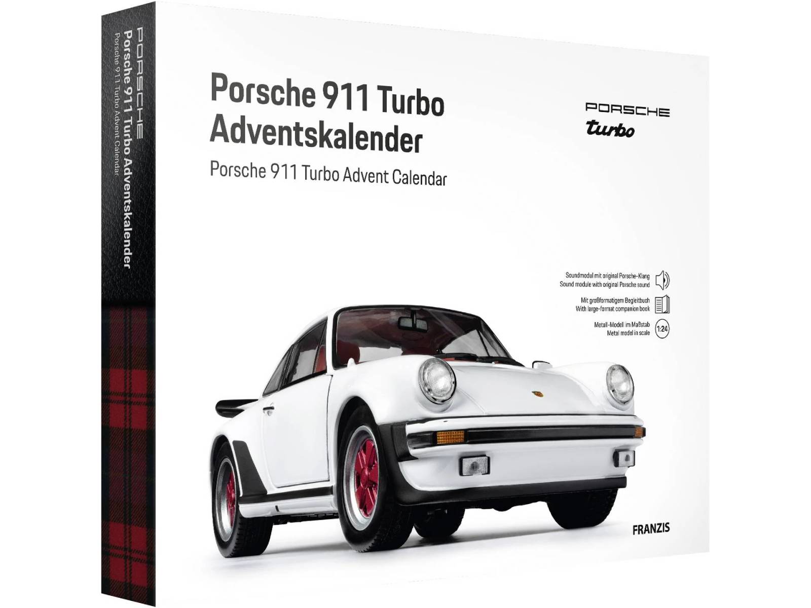 This magnificent 1:24 scale model captures the flashy essence of the 1970s, flaunting elegant lines and the delightful charm of the iconic Porsche 911 Turbo in a dazzling white colour. Each day promises a thrilling surprise accompanied by an exhilarating turbo sound effect that whisks you away to the exhilarating world of vintage racing. As part of your exciting countdown, you'll also find a bilingual companion book that delves into Porsche's intriguing history.