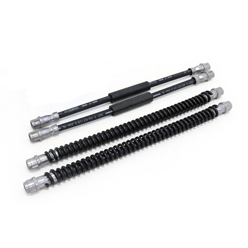 Flexible rubber brake hoses age with heat, road grime and brake fluid exposure — they can dry-rot, crack, bulge or leak, creating an immediate safety hazard. Even without visible leaks, inner-liner deterioration or partial collapse can cause a soft/spongy pedal and uneven braking. Replacing old hoses with correct-fit OE hoses restores reliable pedal feel and prevents catastrophic fluid loss.
