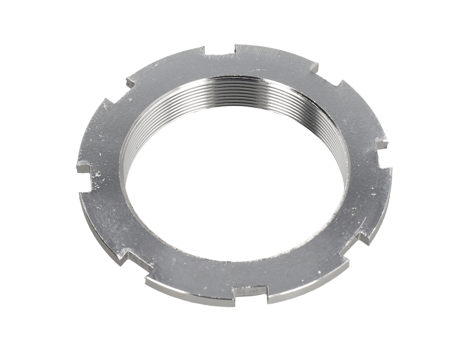 Installed on the front strut/shock assembly, the adjusting nut provides secure mechanical retention and precise positioning of the shock insert or related strut components. Its correct fit and thread engagement are essential for maintaining suspension integrity under repeated load cycles, bumps, and braking forces.