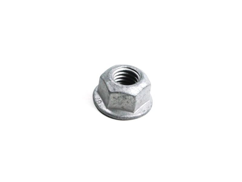 Hexagon collar nut self-locking type (M 10) is a factory spec, used in various Porsche suspension and control arm mounting points. This nut features an integrated collar or flange to help distribute load and maintain torque retention in dynamic suspension joints.