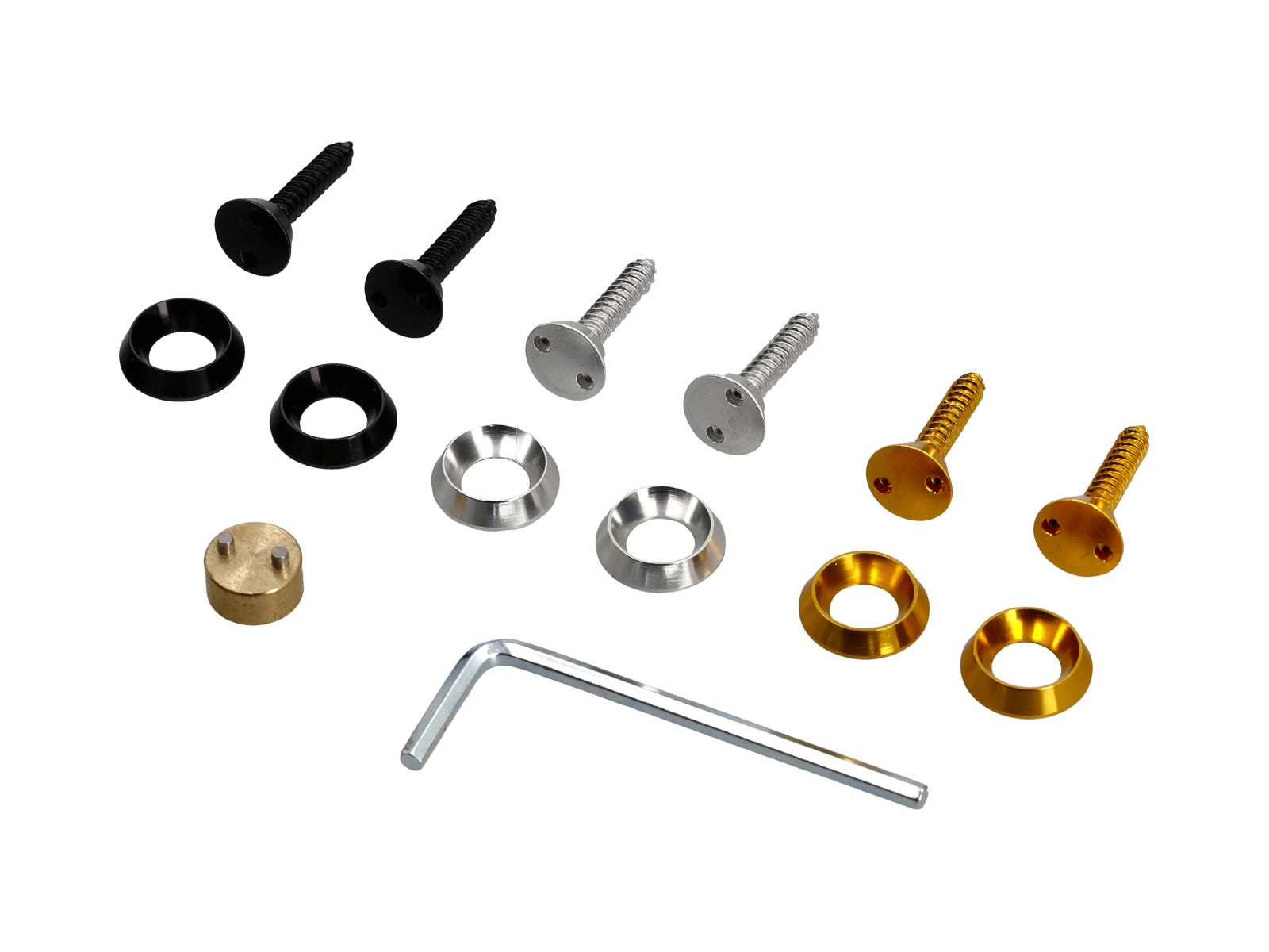 Each pack comes with 2 black. 2 Yellow and 2 Silver bolts. 1 unique locking key and 1 hex wrench.