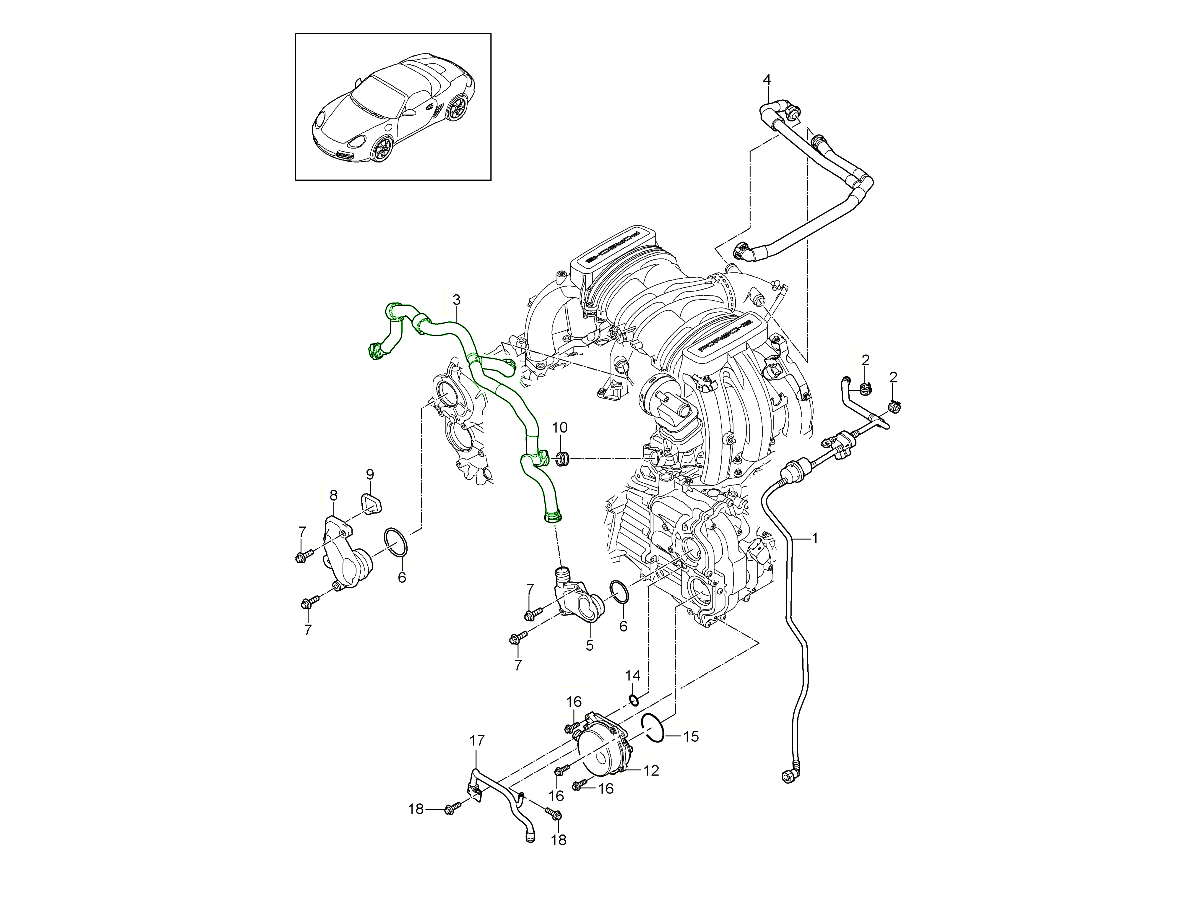 曲轴箱通风软管。9A110751501 曲轴箱通风软管是保时捷 Boxster 和 Cayman 车型上搭载的水冷水平对置六缸发动机的空气/油分离和 PCV 通风系统的原厂指定部件。它连接发动机曲轴箱和空气/油分离器 (AOS) 或通风回路,使曲轴箱气体能够安全排放,同时引导窜气通过相应的过滤通道。