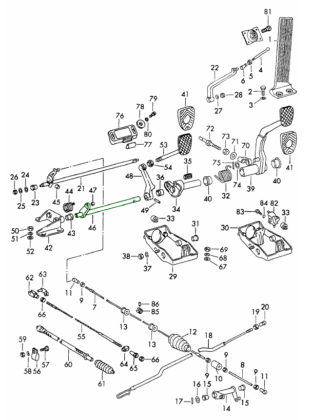 油门连杆反向杆。包括摇臂杆和 2 个衬套。位于变速箱上。