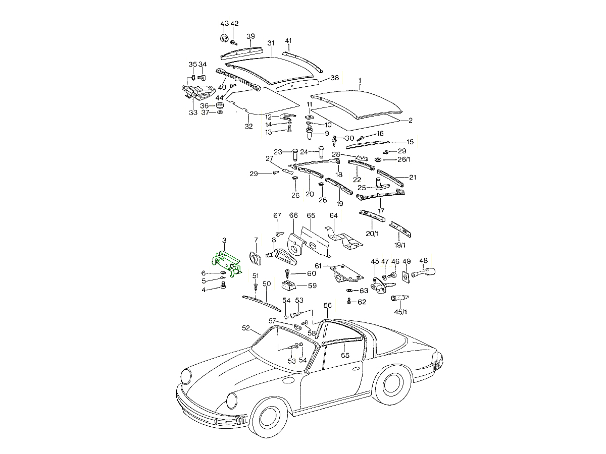 - 经典 911 的 Targa 车顶或敞篷车顶机构使用安装件/附件来正确地锁紧、旋转或张紧车顶面板。