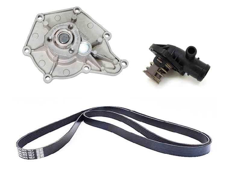 This complete water pump kit includes a new water pump, thermostat, drive (serpentine) belt and the required gaskets for both the pump and thermostat housing.