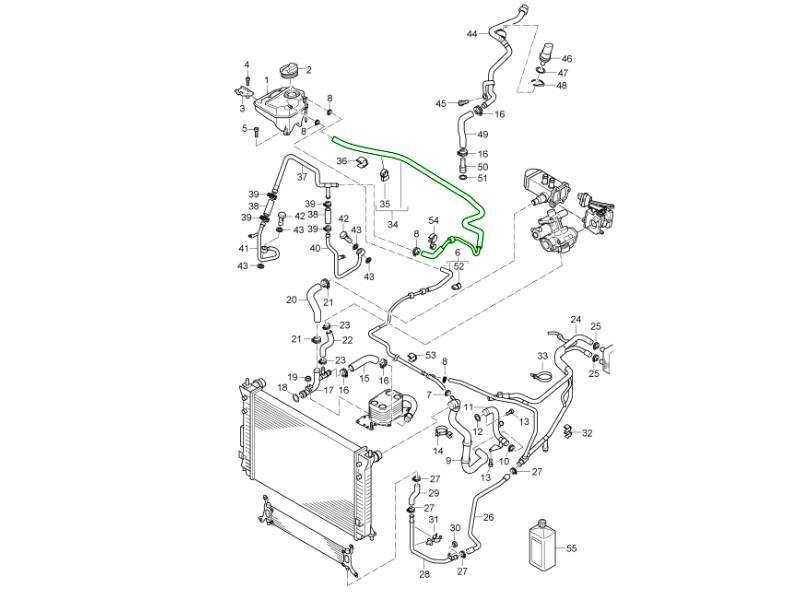 - Visible coolant residue around hose connections