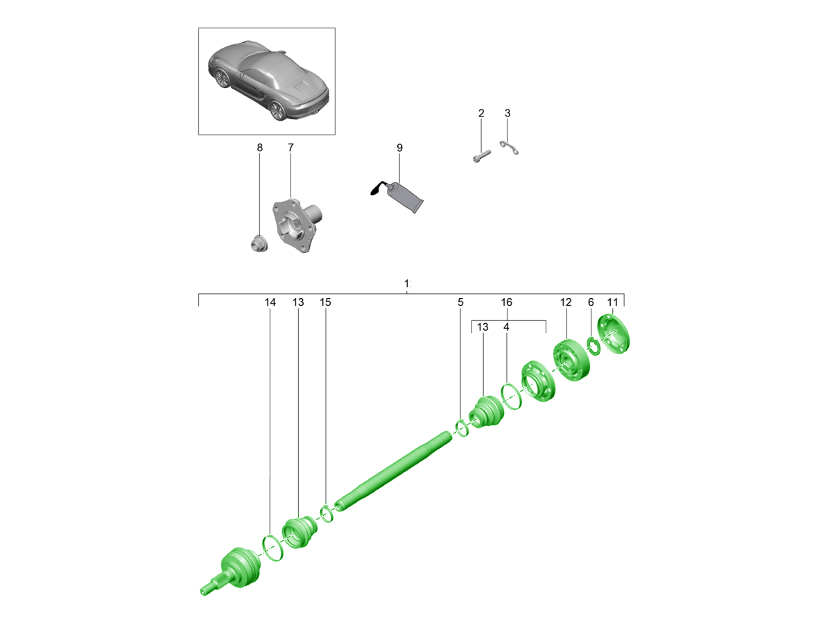 Die hintere Antriebswellenbaugruppe (auch CV-Gelenkwelle genannt) ist als direkter Ersatz für das originale Porsche-Bauteil konzipiert. Sie verbindet den Abtrieb des Hinterachsdifferenzials mit der Hinterradnabe, um Drehmoment zu übertragen und den Antriebsstrang zu aktivieren.