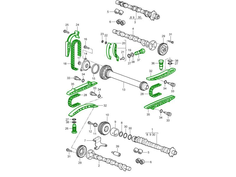 - Bei Arbeiten am Motor (Abnahme der vorderen Motorabdeckung, der Steuergehäuseabdeckung usw.) – wenn das Antriebssystem freiliegt, sollten Sie den gesamten Kettensatz austauschen und nicht nur einzelne Teile.