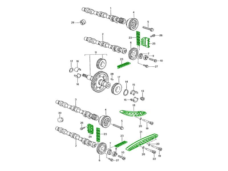 - Das Steuerkettensystem dieser Porsche-Motoren synchronisiert die Kurbelwelle mit der Zwischenwelle und den Nockenwellen – und gewährleistet so die korrekte Ventilsteuerung, den Zündzeitpunkt und den gesamten Motorlauf.
