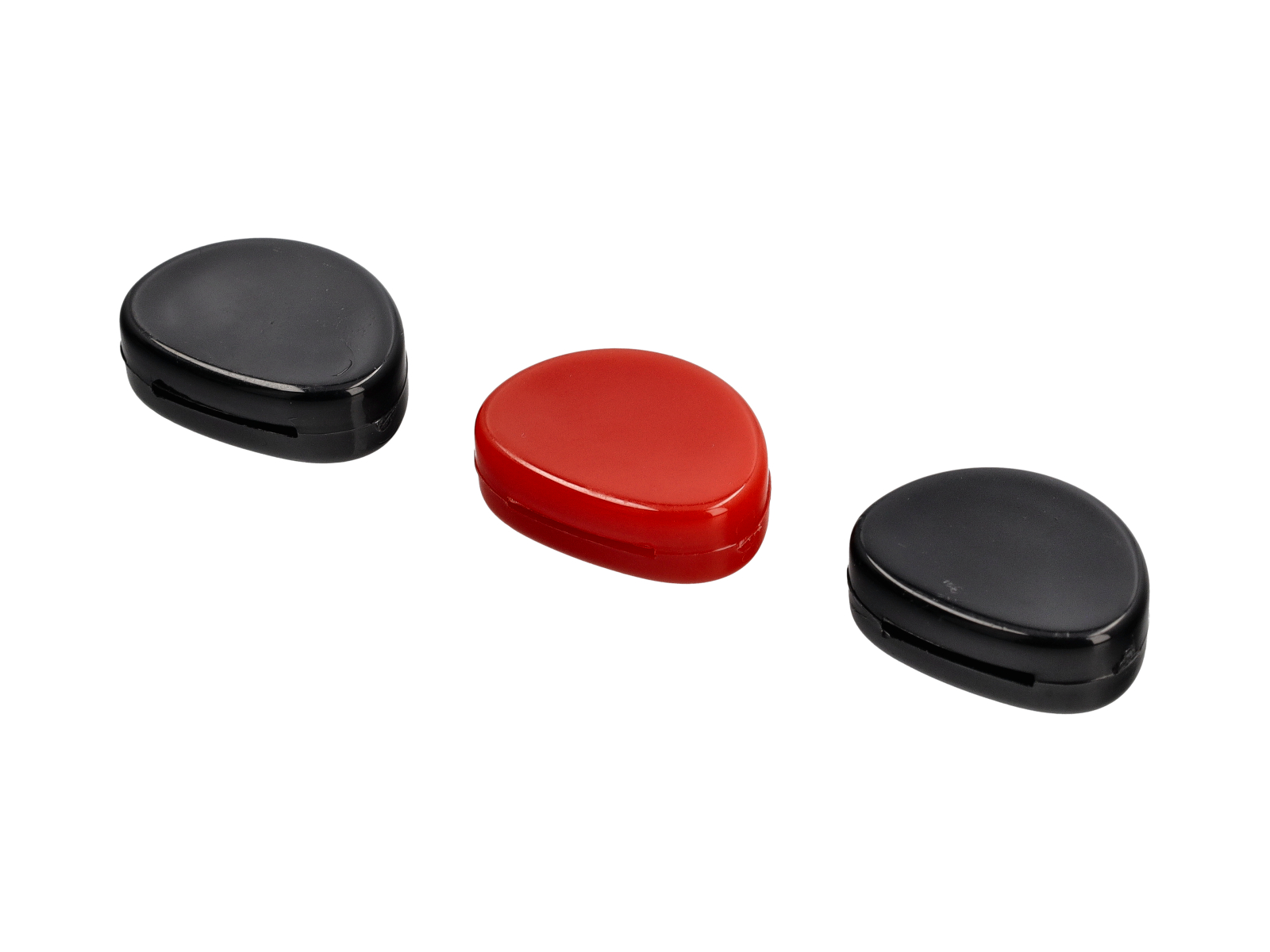 Enthält zwei schwarze Knöpfe und einen roten Knopf.