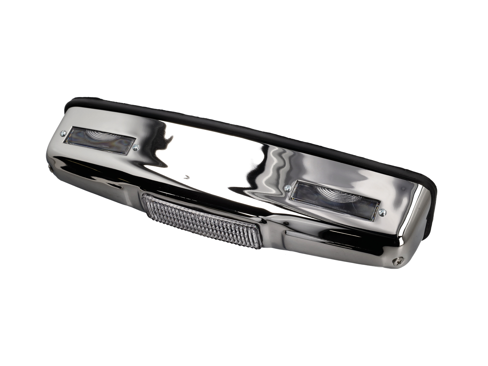 Lieferumfang: 2x Leuchten mit Linse, Chromabdeckungen und Sockeldichtungen, komplett aus Kunststoff.